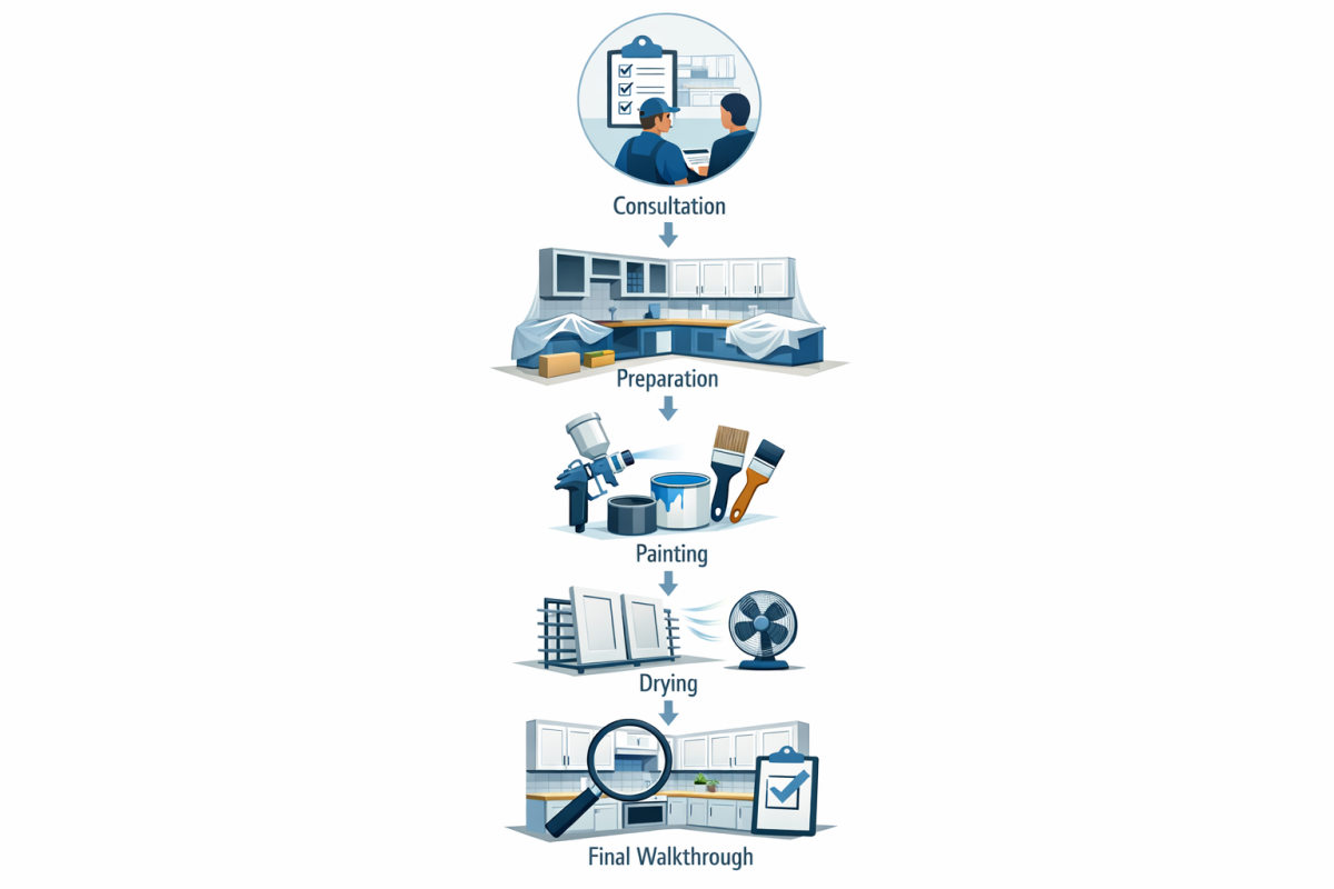 - Some shops remove doors and drawers to a controlled spray facility, which can lengthen total time but reduce onsite disruption.